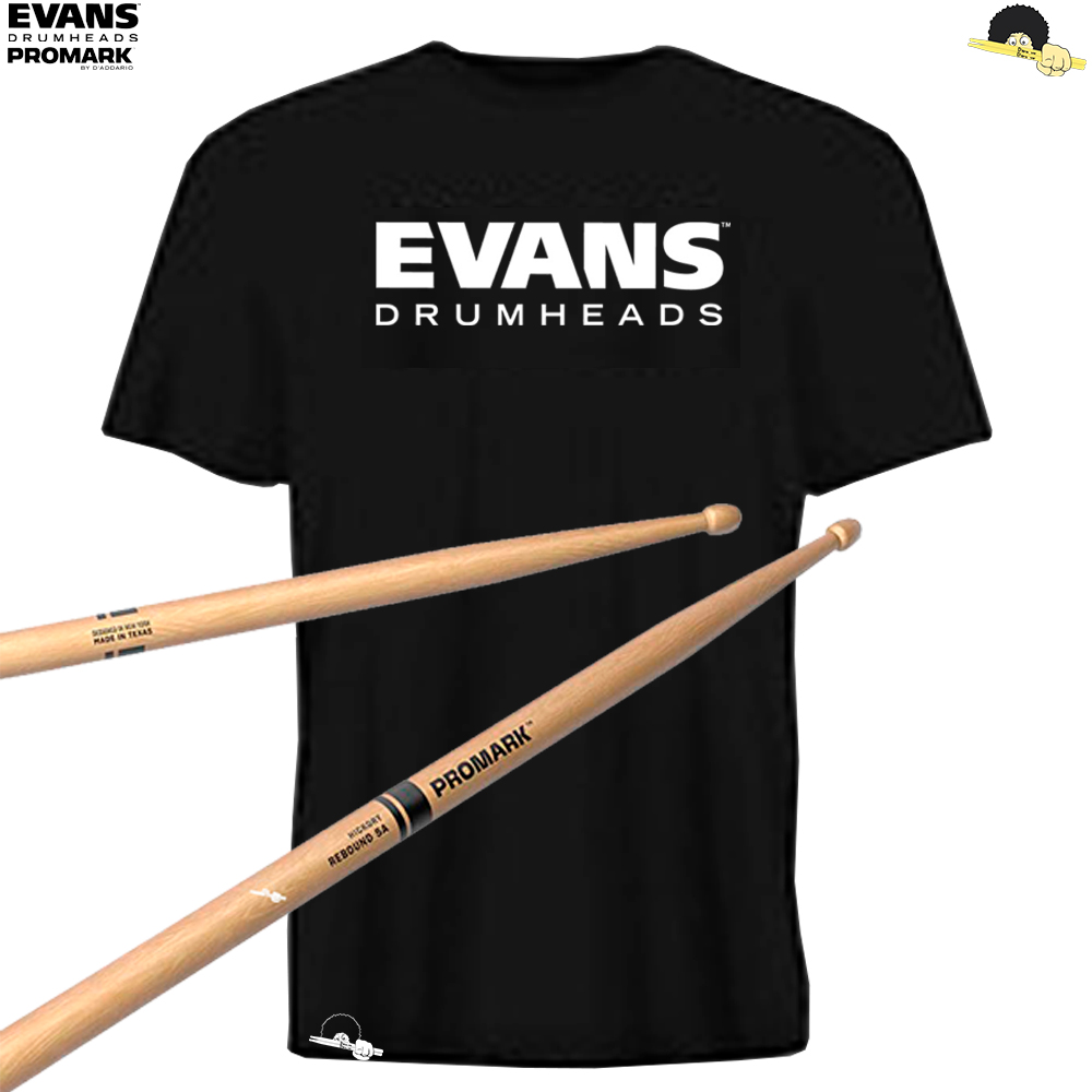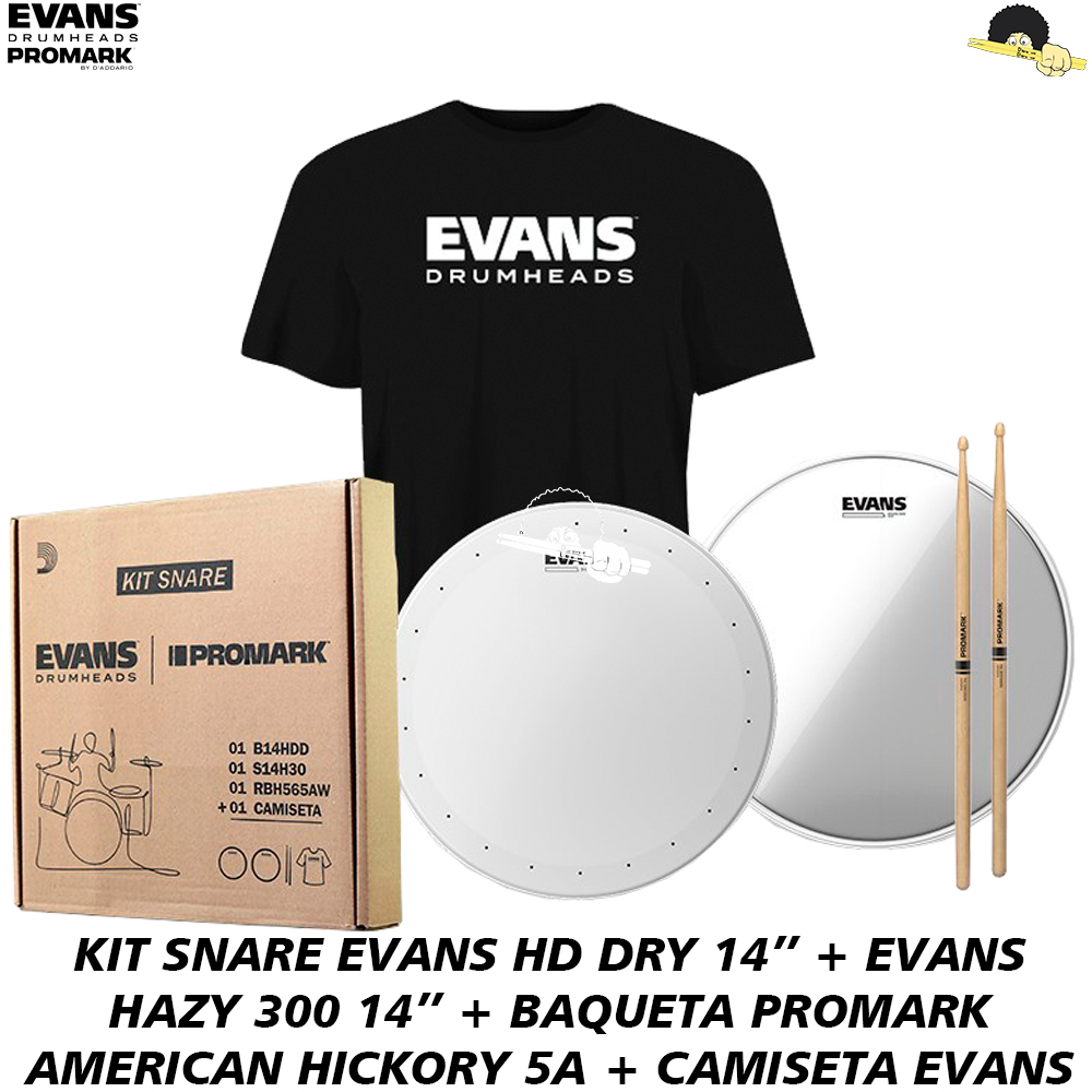 KIT SNARE Evans & Promark: 01 Pele batedeira (HD Dry 14″) + 01 Pele resposta (Side 300 14″) + 01 Promark 5A Hickory + 01 Camiseta Exclusiva Evans