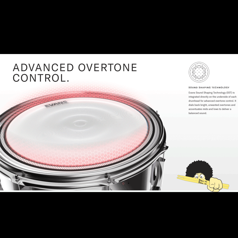 As caixas de alças Evans ™ EC ™ apresentam duas camadas de filme. A combinação de uma camada superior de 7mil e uma base de 10mil fornece um som controlado, mas com ressonância e sensibilidade em todas as faixas de sintonização e dinâmica. Os anéis Sound Shaping Technology ™ (SST ™) na parte inferior reduzem freqüências indesejadas e aumentam o ataque. O ponto reverso empresta durabilidade extra, foco e ataque no centro.