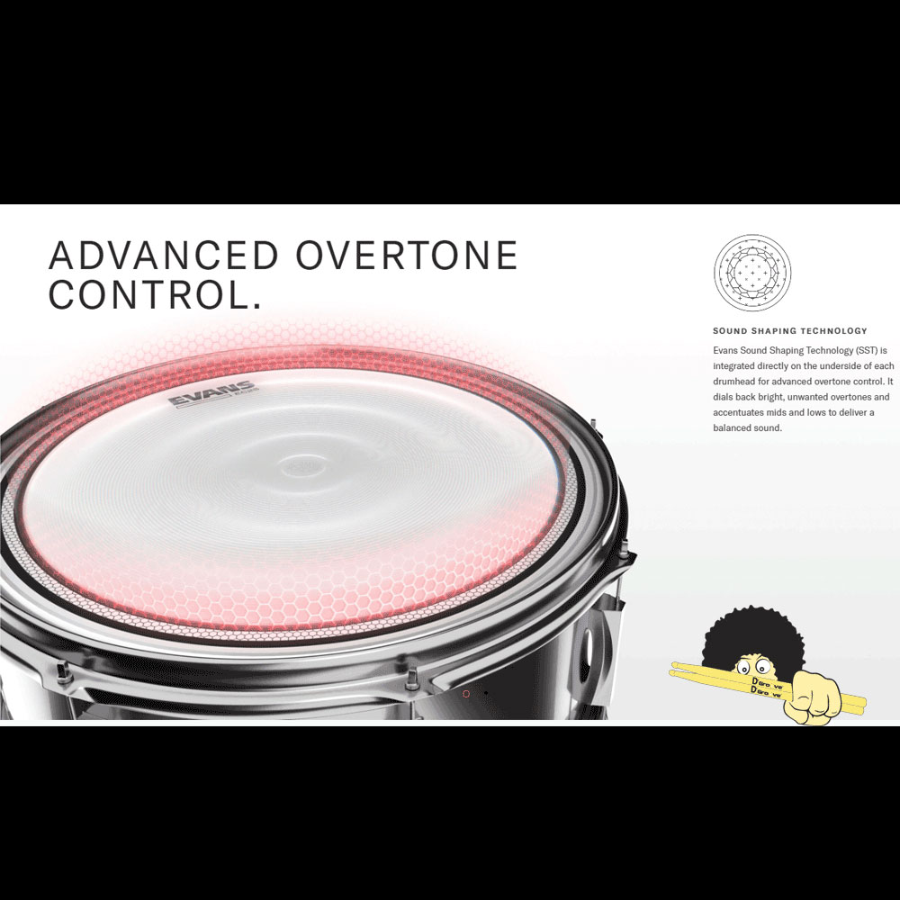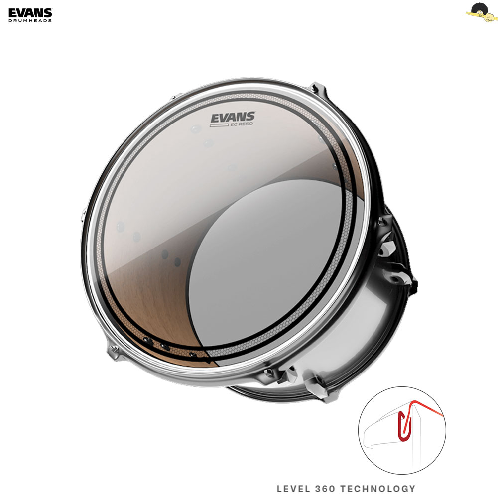 A Evans Drumheads esta presente no mercado há mais de 40 anos, e constituem a mais concisa descrição de uma empresa, que, décadas atrás, foi a pioneira no design e na produção de peles para percussão e hoje é uma inovadora. A maioria das pessoas desconhece que a Evans inventou a pele sintética – seja de plástico ou poliéster – em 1956. Chick Evans (fundador) foi o primeiro a utilizar filme de poliéster para moldar com sucesso, uma pele de percussão, obtendo uma pele resistente às variações climáticas e transformando o mundo da percussão para sempre. Ou seja: Evans foi A Primeira! E também é o sinônimo do futuro em peles para bateria e percussão. As peles EC2 possuem o anel de abafamento com SST na parte inferior de dois filmes de 7 mil. Controlando a vibração da borda (ao invés de eliminá-la), o anel isola e abafa os harmônicos mais agudos, aprimorando os graves e o ataque, além de proporcionar maiores possibilidades de afinação. A Sound Shaping Technology possibilita controlar a espessura e a densidade do anel, além de sua largura. Controlar a posição e a massa do anel permite remover frequências selecionadas para otimizar o ataque, a sonoridade, o sustain e ajuda a facilitar a afinação para cada medida de pele, podendo oferecer um som mais balanceado e pré equalizado por todo o kit. O som desta pele é definido, denso, acentuado, com ataque nítido em todas as afinações.