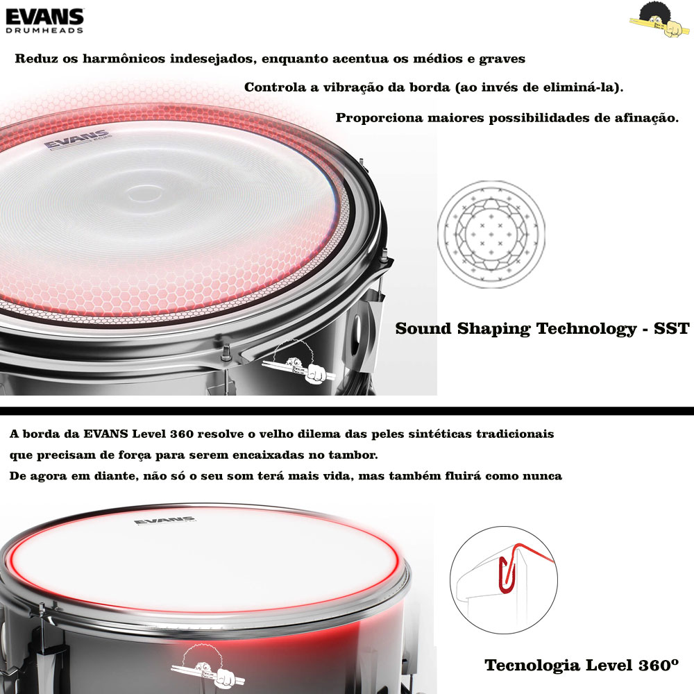 Possuí a tecnologia no aro chamada level 360º, que assenta melhor ao seu tambor e também o anel SST na borda, para controle de harmônicos